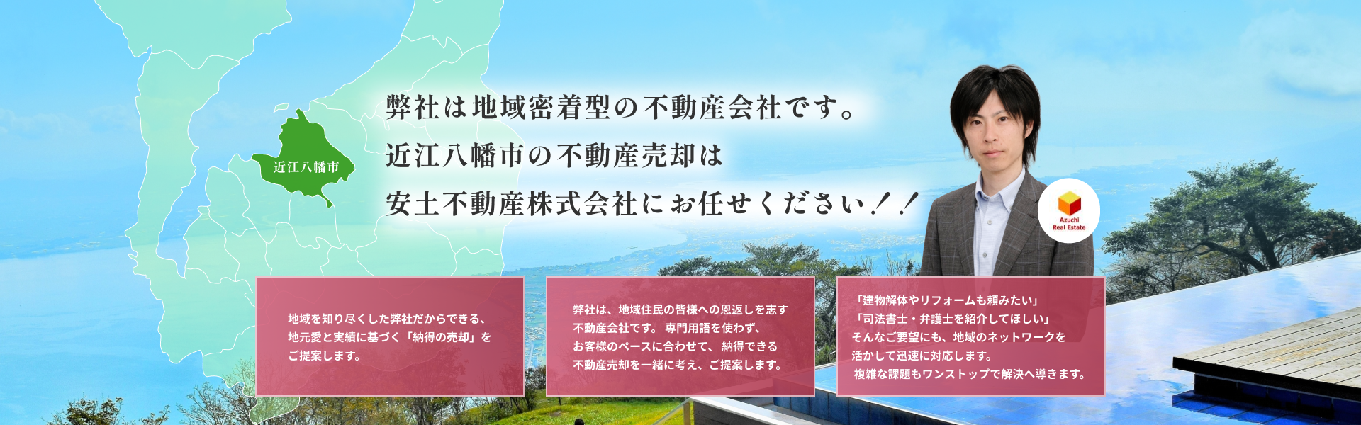 - 安土不動産は、その名の通り近江八幡市・安土町エリアを知り尽くした地域密着型企業です。地元出身の代表が、大手チェーンにはない「深い土地勘」と「独自の地域ネットワーク」を駆使し、物件の隠れた魅力までしっかりと評価。買い手に響く提案で、早期かつ納得価格での売却を実現します。「地元のことは地元の人に任せたい」そんなお客様の声に、フットワークの軽さと誠実な対応でお応えします。